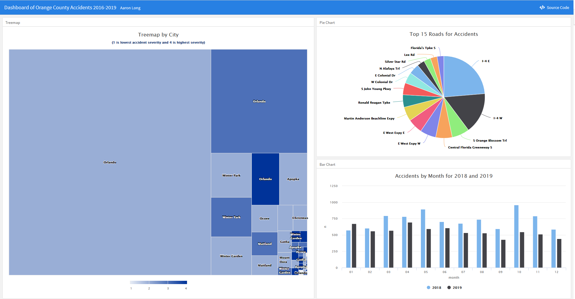 This is an example of an interactive flex dashboard, which is a library in R. The data includes US Accidents between 2016 to 2019 with a focus on Orange County, Florida. The dashboard consists of three different graphs: tree map, pie chart, and bar chart. The charts are created with highcharter.